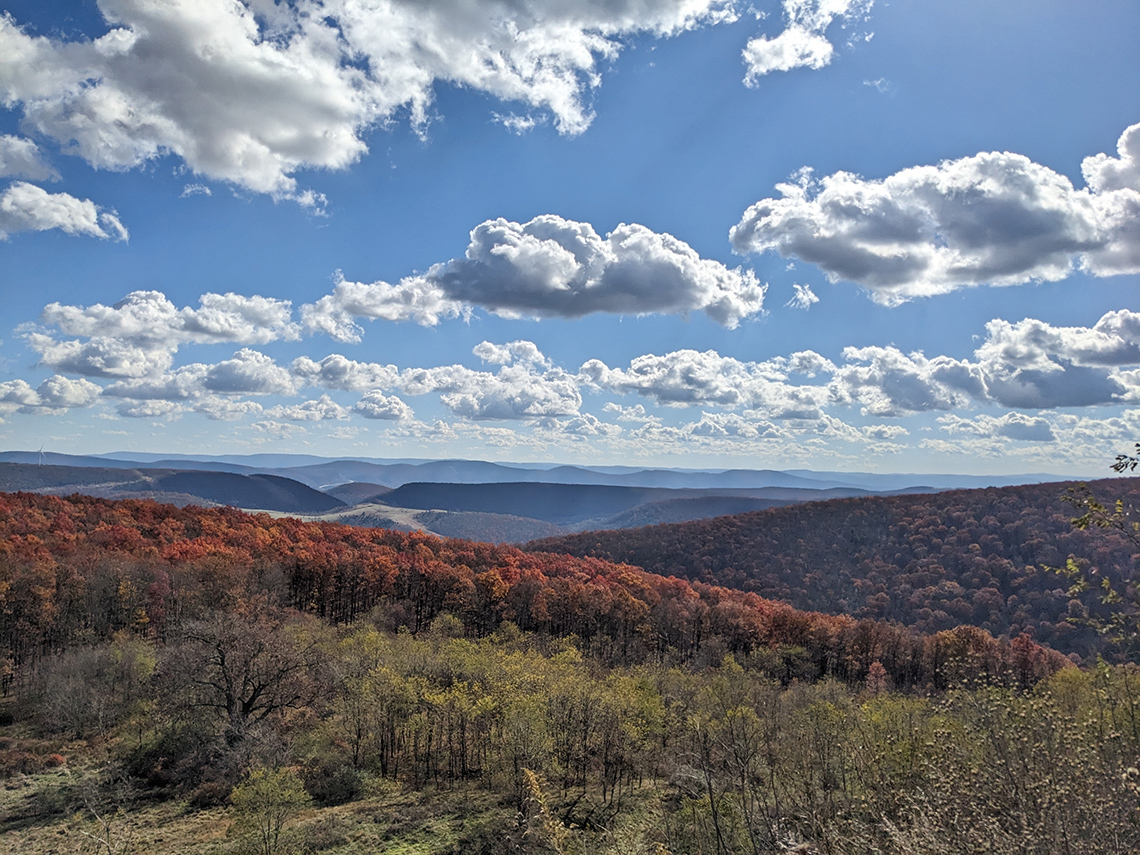 I left Columbus around 5:30am in the fog and rain. Just outside of town I found a Starbuck's and grabbed a coffee and a breakfast sandwich. It was a gray and wet start to the day but the leaves in West Virginia and Pennsylvania seemed to be just past peak color and the oranges and yellows dramatically popped against the drab foggy conditions. Eventually the rain and clouds melted away as the sun came up. Driving through the mountains of Maryland and West Virginia, I was treated to some amazing views along US 48.
