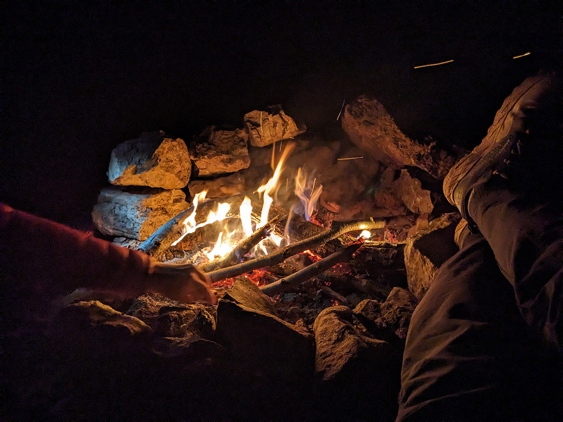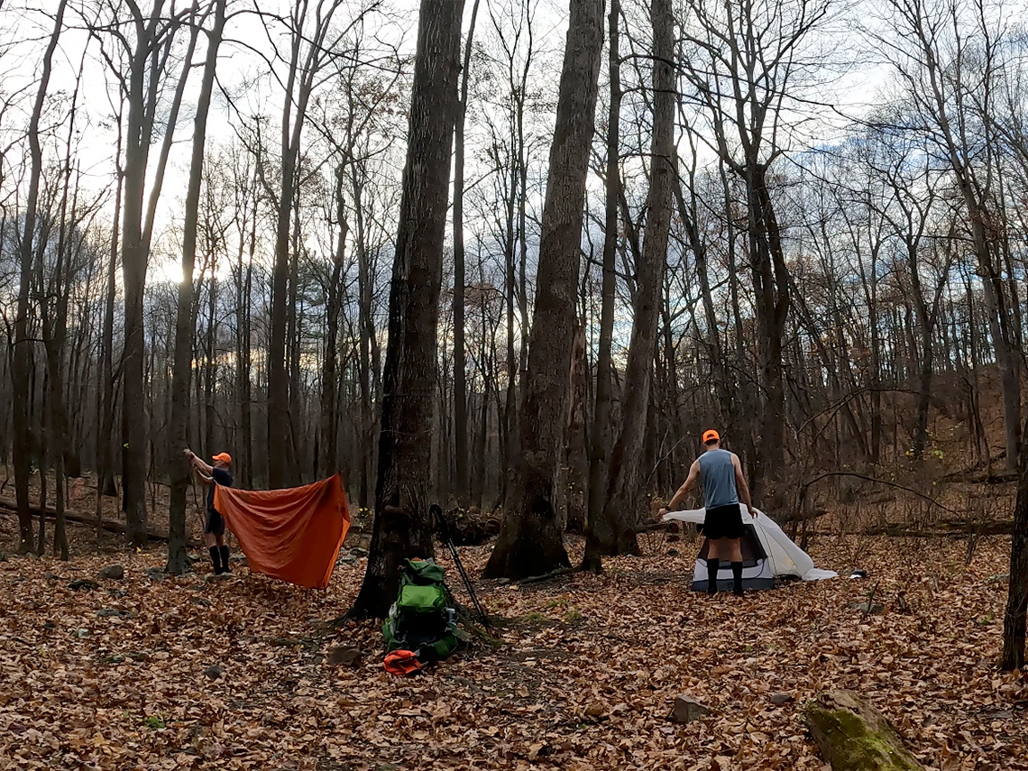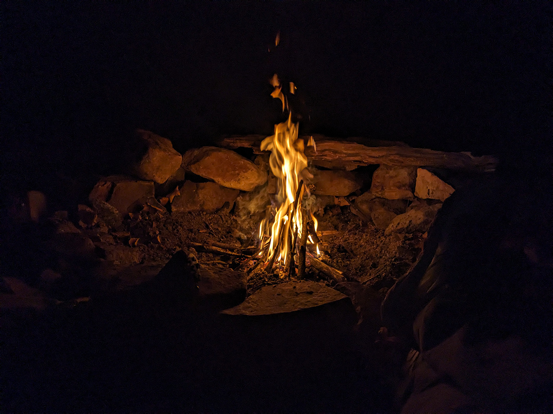 As we descended the trail, our hopes of finding water were slightly fading because all of the tributaries into Halfmoon Run were dry. Just as I had resigned myself to having to ration our water for dinner and maybe not having enough for coffee/breakfast, Chris saw a glint of the sun reflecting off of the creek down in the valley. Water! As we approached the planned campsite at the very bottom of the descent, we heard the sounds of trickling water. It was definitely not the rush of water we were hoping for but it was moving, none the less, and we were grateful for that. We arrived at the campsite and set up our shelters and performed camp chores with a few moments of daylight left to spare. With that, we sat down and enjoyed the campfire and dinner and the silence of the forest.