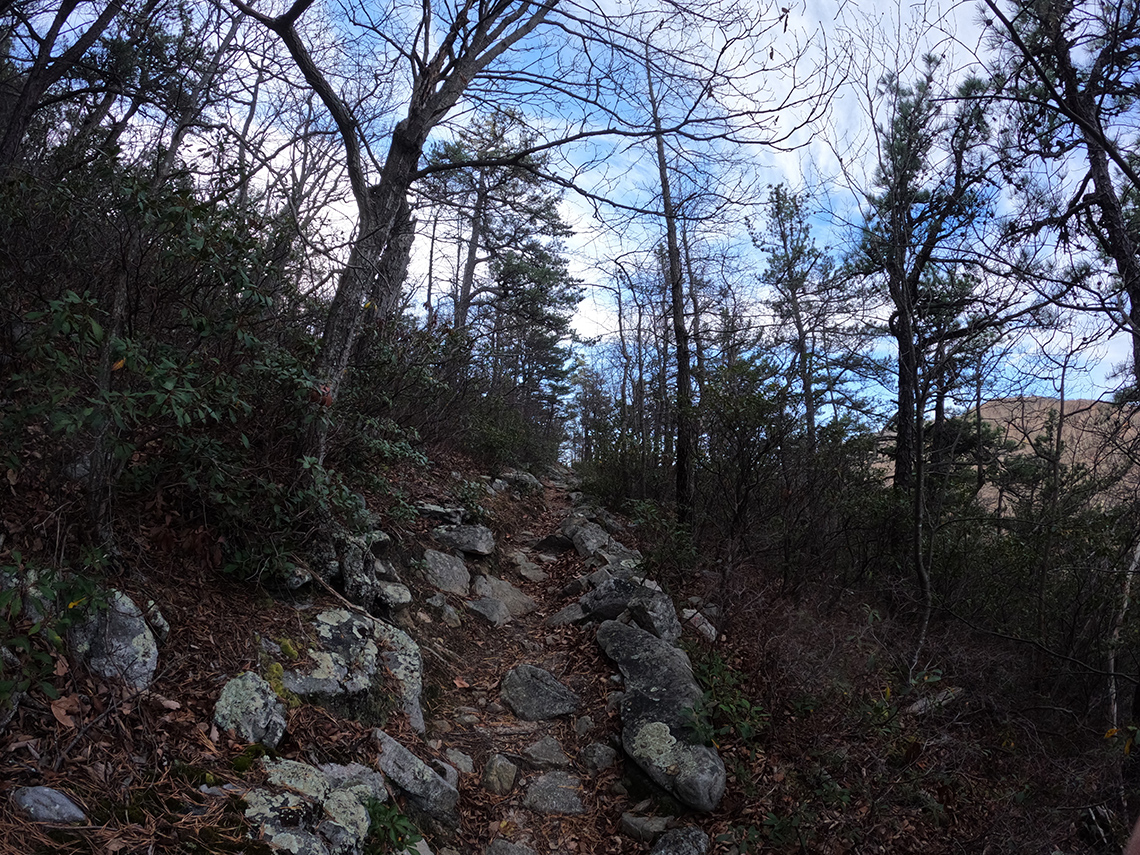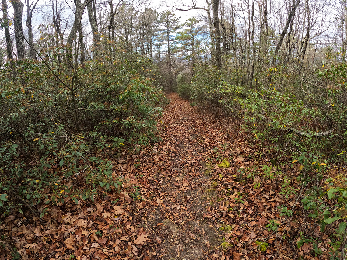 After summitting Big Schloss, we continued along the ridge making our way to Overmill Cutoff Trail. This section was long and seemed to go on forever. Partly because we were pretty tuckered out from the elevation gain we already had in our legs. But also because we had been hiking for a long time. We finally made it to the cutoff trail, hung a left and headed downhill. We remarked that it was getting late and decided we would skip the spur trail up to the top of Halfmoon Mountain in the interest of arriving at camp with a few minutes of daylight left.