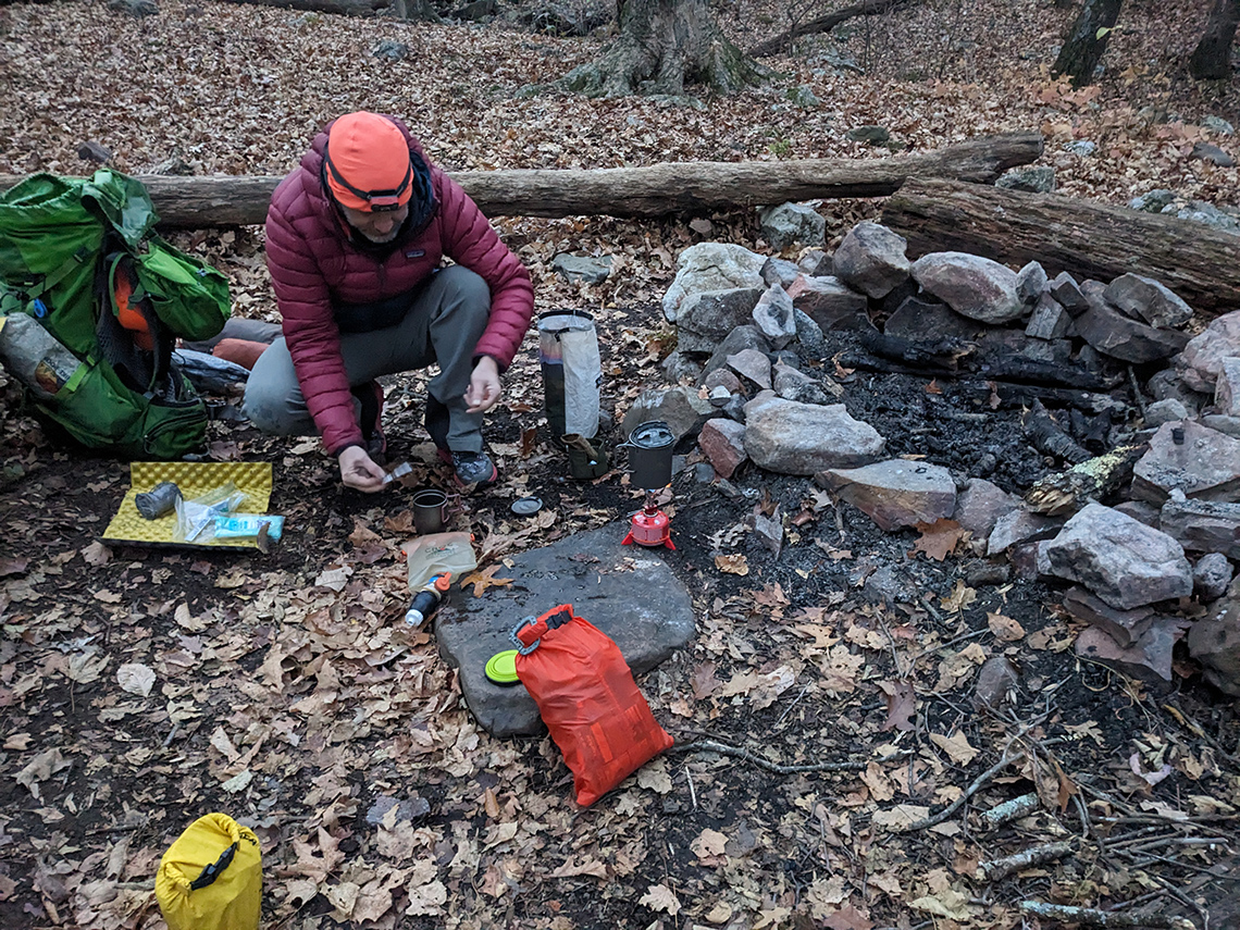 We arrived at the planned campsite with about an hour of daylight left but the creek that seemed closer to the campsite on the map was not there. After setting our packs down, we decided to go scout for the elusive creek. I went down Trout Pond Trail towards the campground, thinking that there'd be water further down in elevation and Chris continued up Long Mountain Trail. I didn't find anything after going about .25 miles down the trail. Upon my return, I was happy to learn that Chris had located the running creek just up the trail. Water source: Check! We set up camp and sat down in our chairs and enjoyed dinner and the campfire.