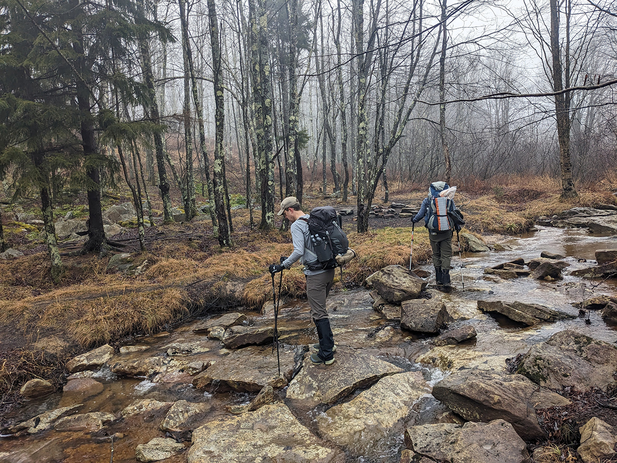 Soon after passing up and over the southern portion of Blackbird Knob, we descended again and encountered our second creek crossing, Red Creek. Because of the recent rain, water levels at Red Creek were above most of the normally exposed rocks which meant we had to get our feet wet. The conveniently placed rocks provided enough of a shallow path for us to safely cross but there was no escaping the water. From that point on, we were dealing with very wet, saturated trails.
