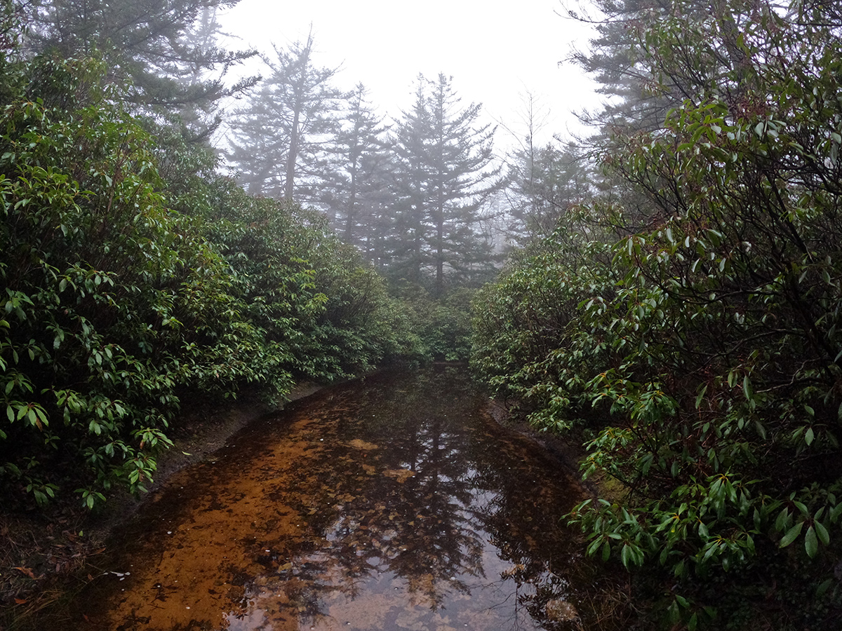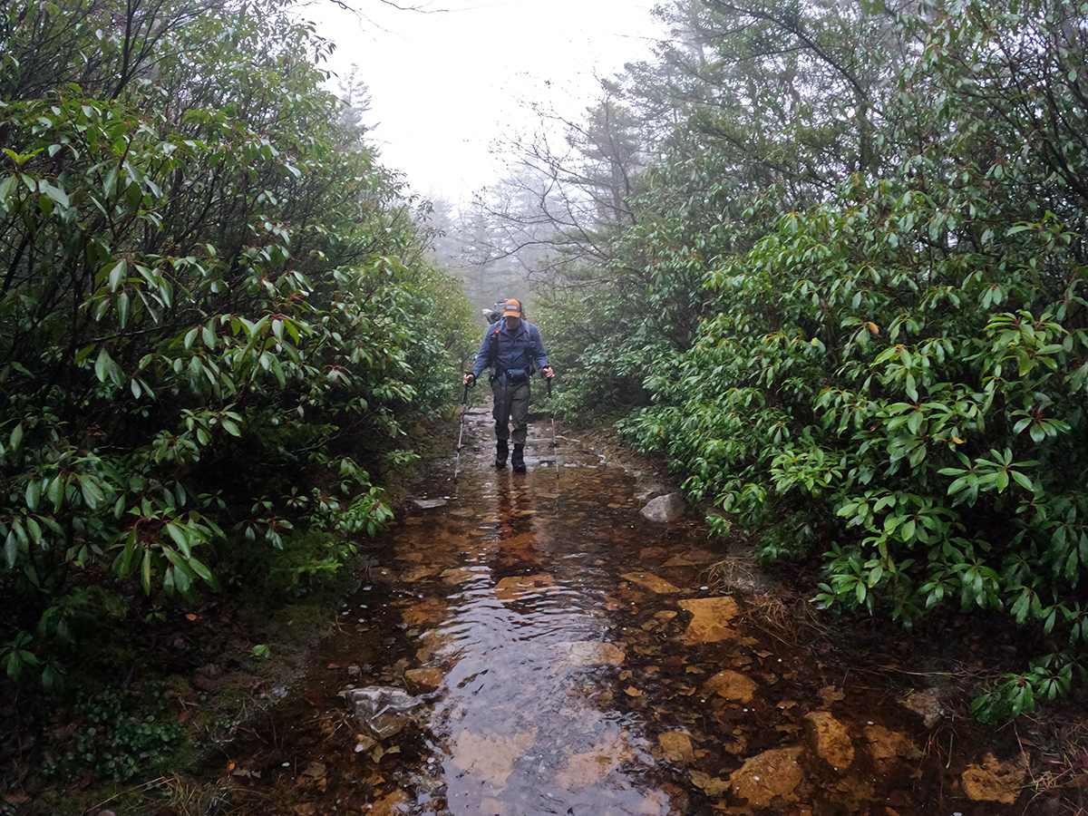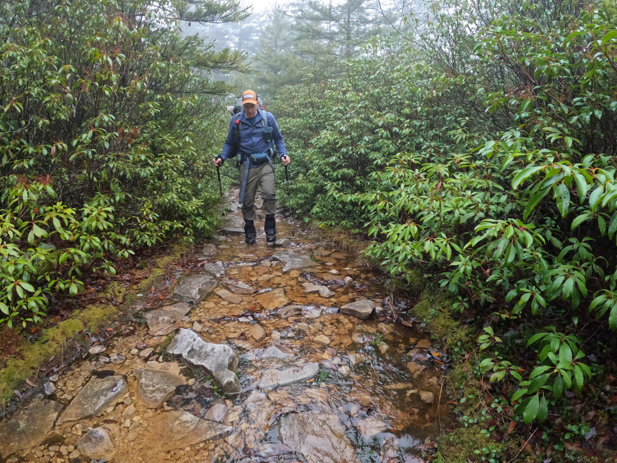 The section between the Red Creek crossing and Harman Trail was a bit of a climb and then it eventually leveled off. As it leveled off, it was clear that the water really didn't have a place to go and the trails became creeks. Shin deep in places, there was really no way to rock hop or avoid it because of the thick rhododendrons and Mountain Laurels on either side of the trail.