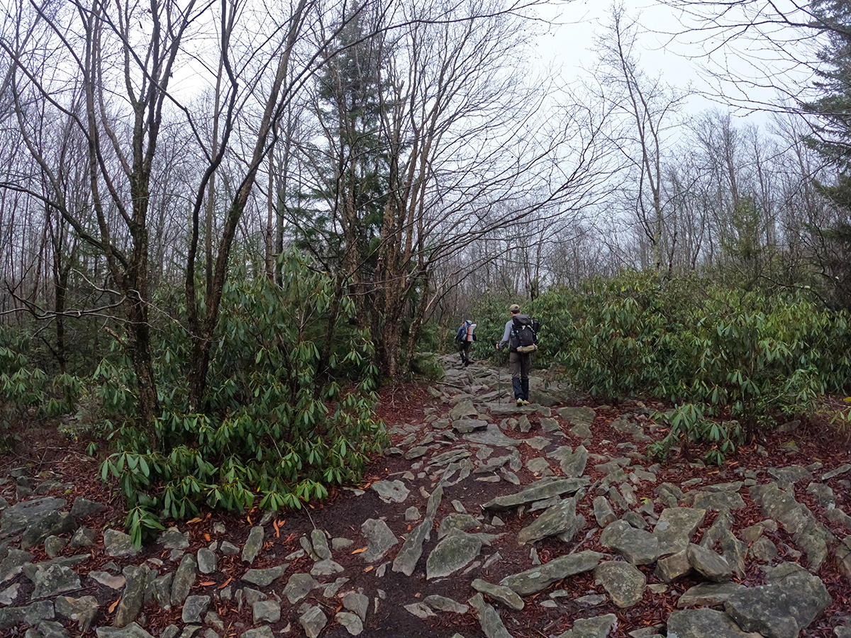We met at the Blackbird Knob trailhead on Forest Road 75 around lunchtime. I drove from Columbus, OH, Dan from Pittsburgh, PA, and Mike from Greensboro, NC. The conditions were gray, a bit foggy, slightly windy, and right on the border of shorts weather (for me). Temps were in the low 40's, maybe even upper 30's. Trailheads weren't too crowded but there was still a fair amount of activity along FR 75. There were a couple of backpacking groups at the Bear Rocks trailhead and lots of dayhikers. We said our hello's and caught up on life stuff, got our packs situated, and then headed out on the trail. As we were crossing the dirt road, we ran into the trail steward who gave us some maps. He also mentioned how wet conditions were and that it would be difficult to keep a fire going. With that, we headed out onto the trail.