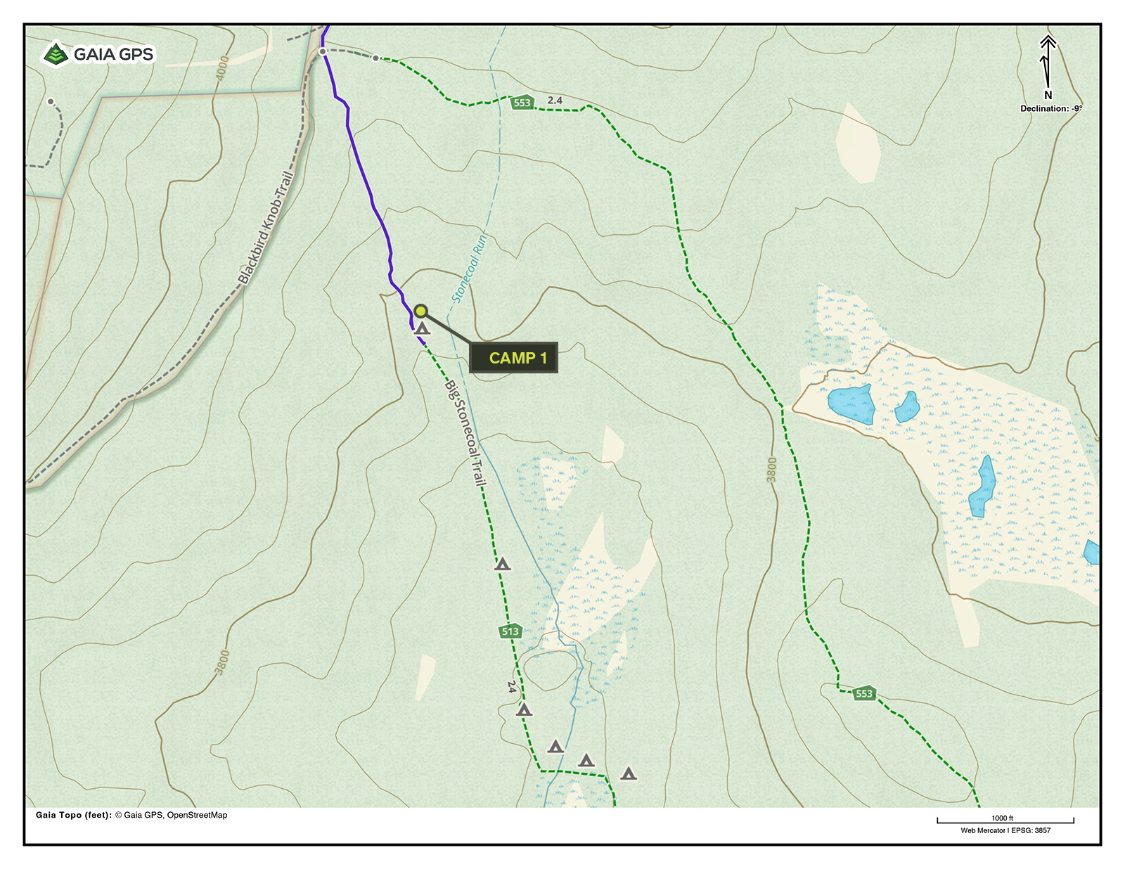 | Day 1: Blackbird Knob trailhead to Camp 1 | 5-5.5 miles | +757 ft./-860 ft. | ~2:30:00 |