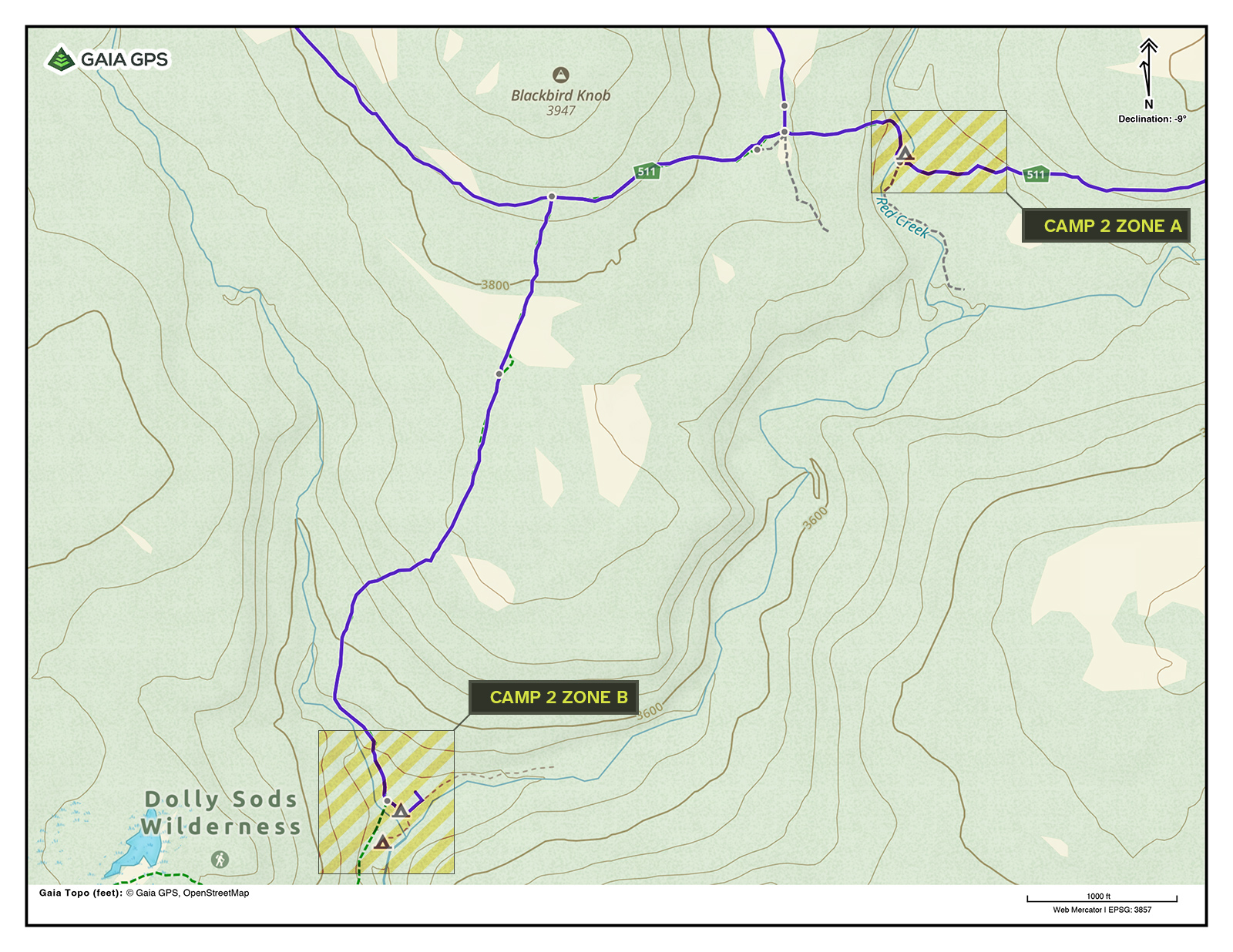 For the second night, the plan was to either head down Red Creek Trail to a cluster of campsites at an elevation of about 3,000 feet (Zone B on the map) at the junction of several major creeks or camp along Blackbird Knob Trail, somewhere near Red Creek (Zone A on the map). Zone A would be preferred, but if the weather was windy, we would camp at Zone B because it is lower in elevation.