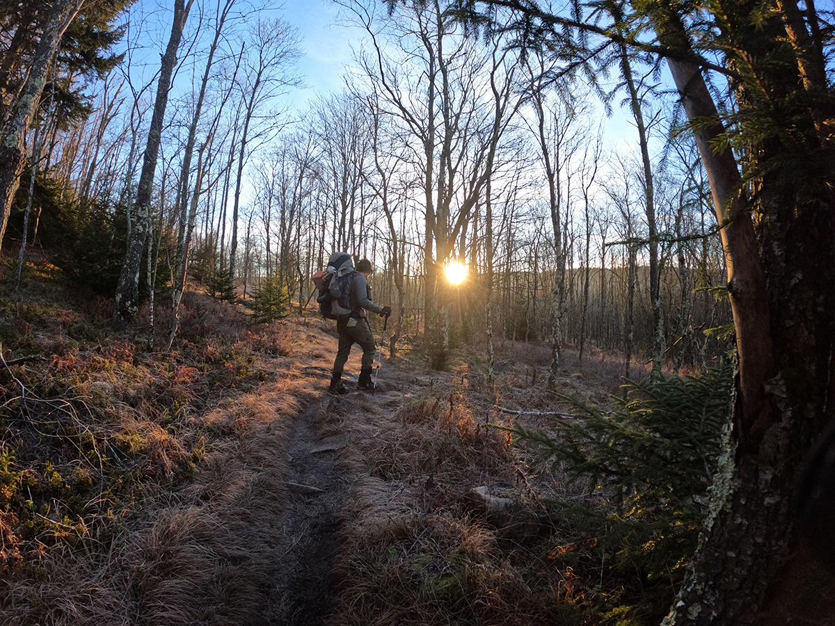 We awoke around 6:00 a.m. and got coffee and breakfast going. After breaking down camp, we were on the trail by about 7:30 a.m. It was a quick hike out to the cars but we heard gun shots off in the distance due to it being the first day of deer hunting season. We moved cautiously with this in mind as we hiked. What was muddy 2 days prior had frozen over into a nice crust. Though there were still sections of rock hopping, we were able to successfully keep our feet dry. We paused in a few places to take pictures of the beautiful sunrise and before we knew it, we were back at the trailhead. After signing the trail registry, we got our cars packed, chatted for a bit then said our goodbyes. Trip complete!