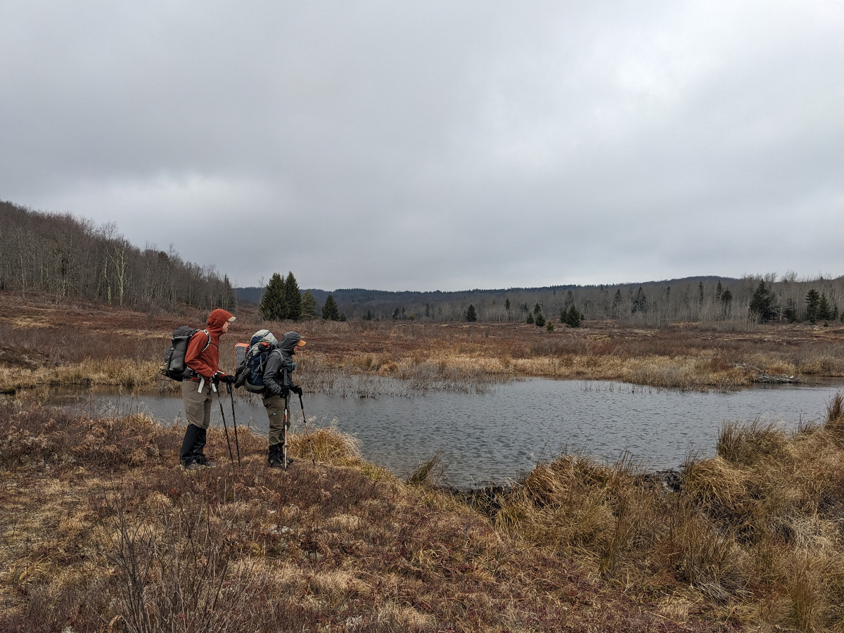 After a quick lunch, we set off along the Upper Red Creek Trail, winding through small stands of spruce. True to the trip’s theme, the trail remained stubbornly soggy, forcing us into a game of rock hopping to keep our feet dry. We eventually rejoined Blackbird Knob Trail, successfully completing our planned loop. Here, we faced a choice: push on toward the Red Creek Trail junction and head south or find a spot along Blackbird Knob Trail. Fearing high water levels where the two creeks meet along Red Creek Trail, we opted for the safer route. Heading back down Blackbird Knob Trail meant we had to cross back over Red Creek—the same one we’d tackled on Day 1—we were rewarded with a perfect campsite tucked just beyond the bank.